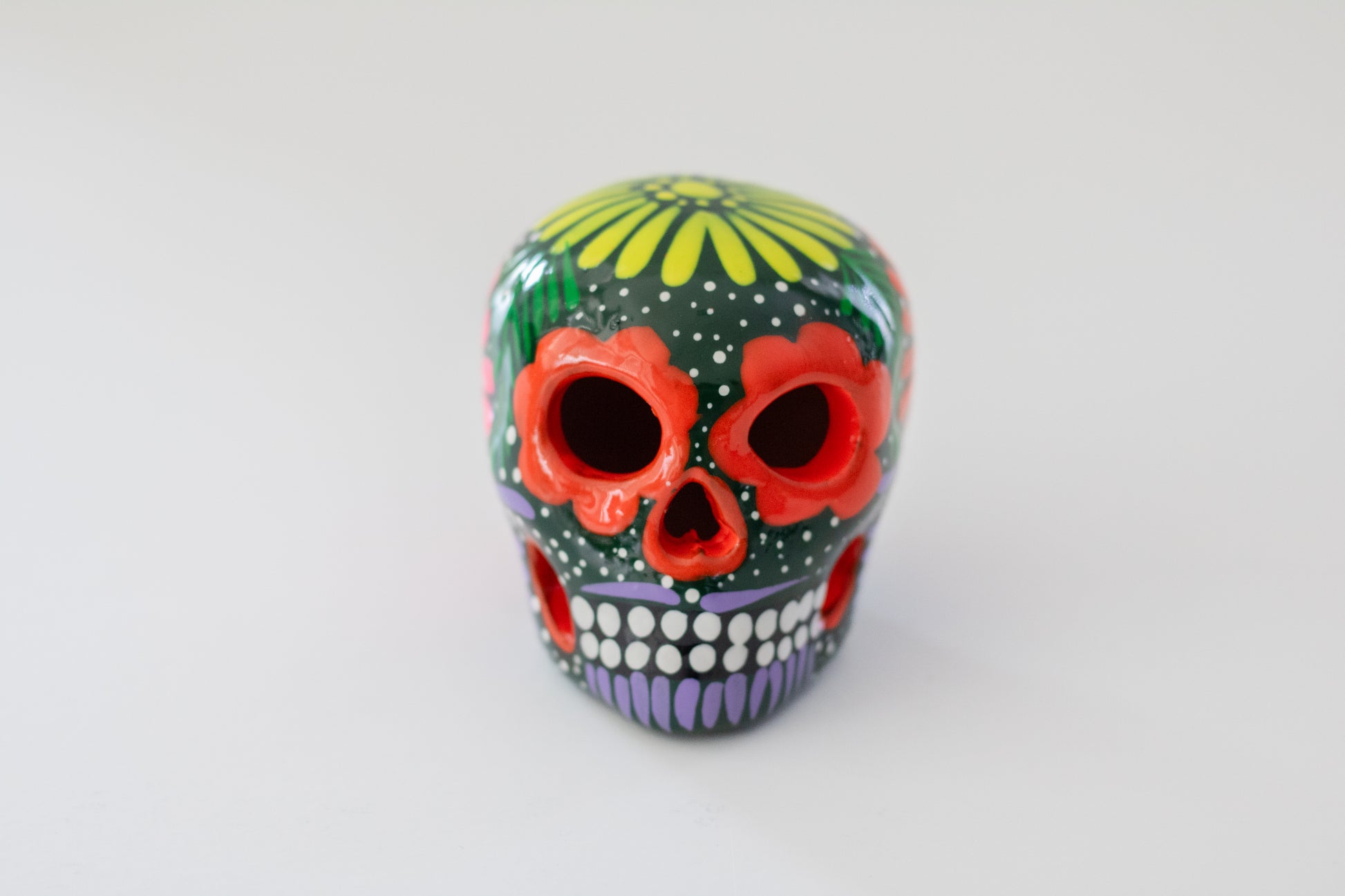 Crafted from clay and hand painted by family-run studio, EYA Arte, each calavera (clay skull) is unique with it's bold colors and floral designs. Add an LED tea light beneath the skull to bring your ofrenda to life.