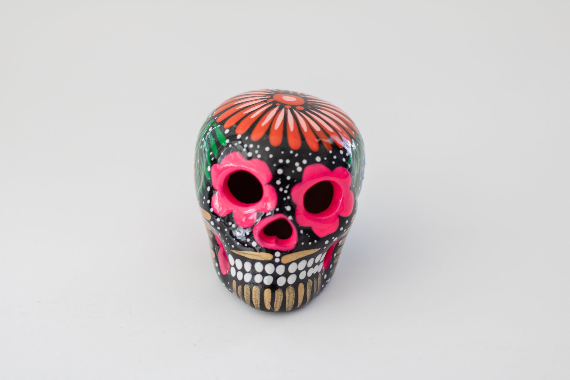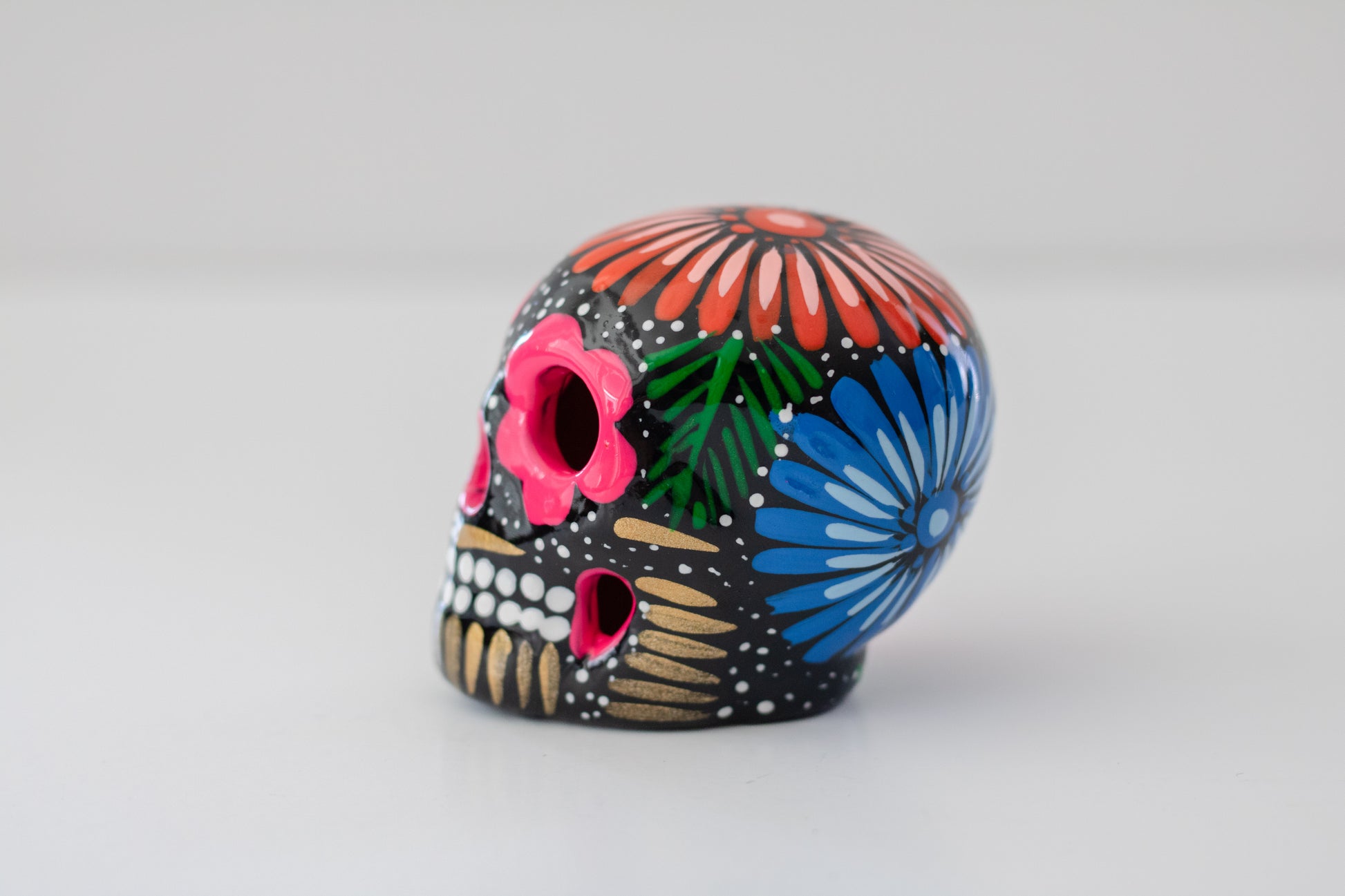 Crafted from clay and hand painted by family-run studio, EYA Arte, each calavera (clay skull) is unique with it's bold colors and floral designs. Add an LED tea light beneath the skull to bring your ofrenda to life.